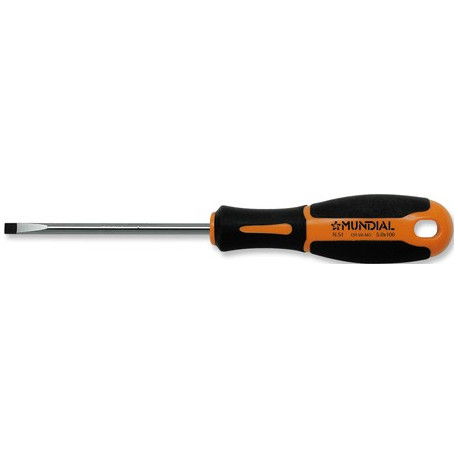Cacciavite a taglio con lama piatta parallela, in acciaio cromo vanadium molibdeno. Impugnatura ergonomica bicomponente.