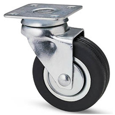 Ruota in gomma nera con piastra girevole. Esecuzione zinco-cromata. L'impiego e' consigliato per mobili d'ufficio, espositori, ecc..