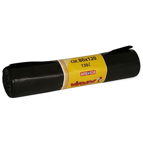 Sacchi in polietilene con laccio di chiusura. Saldatura laterale estesa antigoccia. Colore nero. Rotolo da 10 sacchi.