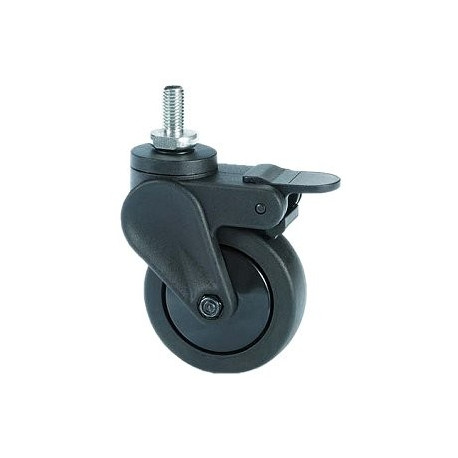 Supporto in nylon e fibra minerale, perno in acciaio filettato MA10 lunghezza mm.20. Ruote con nucleo in nylon e battistrada in poliuretano, diametro mm.75. Portata kg.60