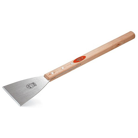 Raschietto in acciaio temperato. Spessore lama: 2 mm. Manico in legno 350 mm. Larghezza 100 mm.