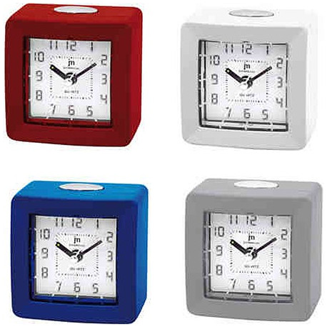 Sveglia al quarzo analogica con crescendo, luce (illuminazione dei numeri) e snooze (ripetizione dopo 5 minuti). Movimento continuo silenzioso. Dimensioni 7,5x7,5x4 cm. Colori assortiti.