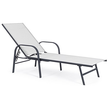Poltrona sdraio multiposizione, pieghevole con struttura in tubo d'acciaio di diametro 22 mm e telo color grigio in textilene. Adatta per esterni. Braccioli ergonomici, cuscino imbottito. Dimensioni 62x142x120 cm.