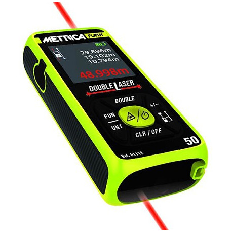 Misuratore con doppio raggio laser. Consente di effettuare misurazioni senza partire dall'estremita' della distanza. Portata 50 mt totale. Precisione +/- 3,00 mm. Display retroilluminato su 4 righe. Funzioni: misurazione continua, distanze, superfici, volumi, 2 funzioni pitagora, somma e sottrazione. IP54. Dimensioni 85,5x38x19,5 cm. Autospegnimento. Batteria Li-Ion ricaricabile.