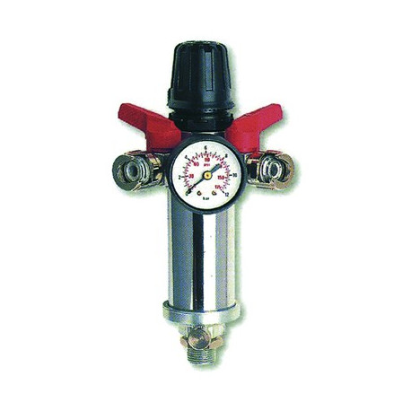 Dotato di filtro e manometro. Filettatura inferiore 3/8". Manometro diametro mm 40 con scala 0-12 bar. Materiale: alluminio nichelato.