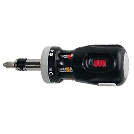 Cacciavite a cricchetto corto con impugnatura ergonomica in plastica infrangibile, attacco femmina da 1/4', dotazione 7 bits con inseriti nell'impugnatura. Misure assortimento: 1 x PH1 / PH2 / PH3 / FL4.0 / FL5.0 / SW4.0 / SW5.0