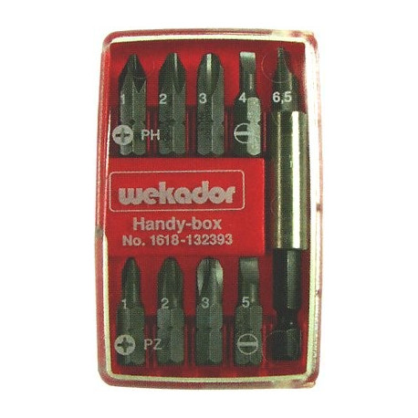 Contenuto: Nr. 3 bits a taglio (4 + 5 + 6,5 mm.) + Nr. 3 bits a croce PH (PH1, PH2, PH3) + Nr. 3 bits a croce PZ (PZ1, PZ2, PZ3) + Nr. 1 portainserti magnetico