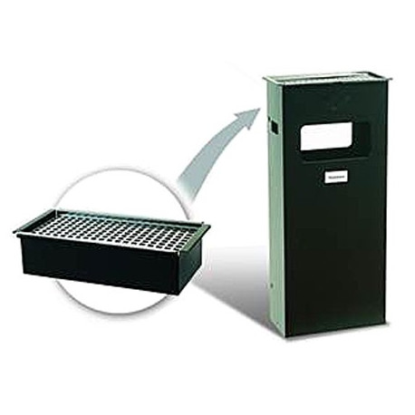 Posacenere e gettacarte per esterno in lamiera verniciata a polvere epossidica. Cestello superiore estraibile. Colore grigio scuro. Dimensioni 300x150x700h. Peso kg 5,6