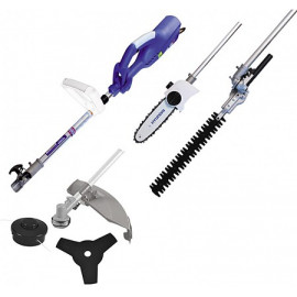 Potenza 1200 Watt. 10000 giri/min. 4 differenti possibilita' di taglio: taglio dell'erba, cespugli, taglio e sagomatura di siepi, potatura, taglio di piccoli frutteti e alberi ornamentali. Testina con filo in nylon, disco metallo 255 mm, potatore 240 mm e tagliasiepi 430 mm. Asta ad attacco rapido. Impugnatura ergonomica softgrip. Peso 9,5 kg. Dimensioni 1870x100x50 mm.