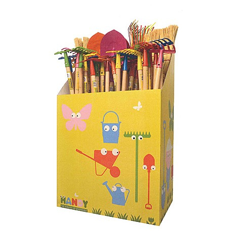 Espositore HANDY JUNIOR dimensioni cm 60x40x117. Contenuto 50 pezzi: 10 scopette in saggina, 8 badiletti, 8 scopette in metallo, 5 zappette cuore, 5 zappette quadre, 14 rastrellini.