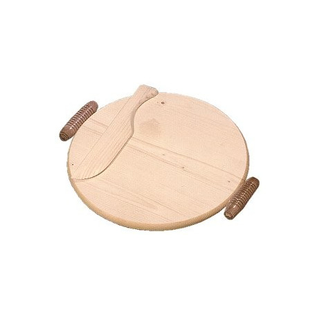 In legno di abete, con bordi arrotondati e manici a pannocchia. Completi di coltello in legno.