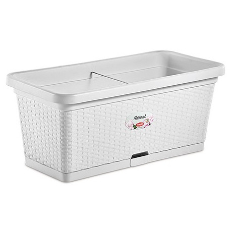 Fioriere con rinforzo interno e riserva d'acqua. Finitura midollino intrecciato. Complete di 4 ruote. Capacita' lt 66. Dimensioni 80x40x34 cm.