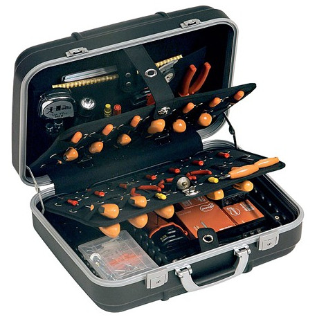 Valigia portautensili professionale in policarbonato e ABS, antiurto ed ad alto spessore. Tasca portadocumenti. 1 pannelli portautensili con elastici o tasche. Fondo termoformato in polistirolo con scomparti modulabili e 2 portaminuterie. Maniglia in ABS satinato con impugnatura morbida, ergonomica e antiscivolo.