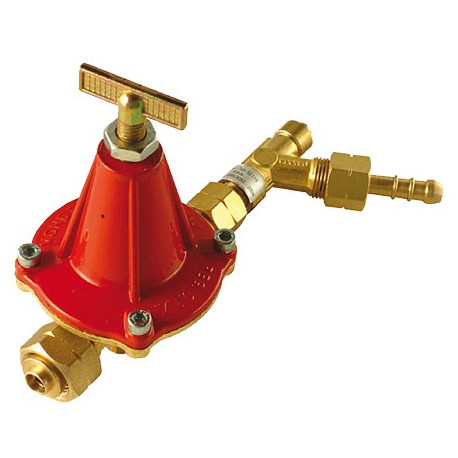 Riduttore di alta pressione 12/14 kg/h a taratura variabile 0-4 bar con valvola di blocco per eventuale distacco del tubo collegato. Indicato per posatori di guaine.