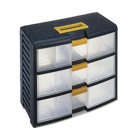 Cassettiera modulare trasportabile, con maniglia ergonomica a scomparsa. 3 cassetti con divisori mobili e chiusura brevettata. Dimensioni (L x P x H) mm. 391 x 197 x 334
