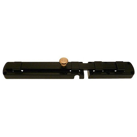 Catenaccio orizzontale lunghezza cm 30. Applicabile a scuri e portoncini ad 2 ante. Fissaggio sopra l'asta della spagnoletta. Verniciato nero.