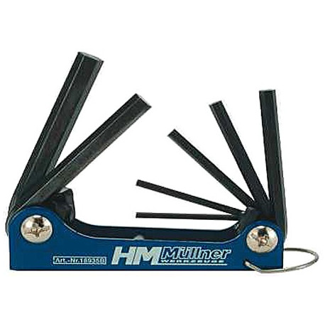 Serie 7 pz. chiavi maschio esagonale mm 2,5-10. In acciaio al cromo vanadio, brunite. Fornite con supporto in metallo pieghevole.