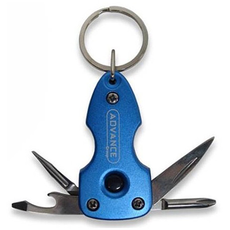 Portachiavi in metallo multiuso, con 5 funzioni (coltello, 2 cacciaviti, apribottiglia, punteruolo e luce led). Colori assortiti.