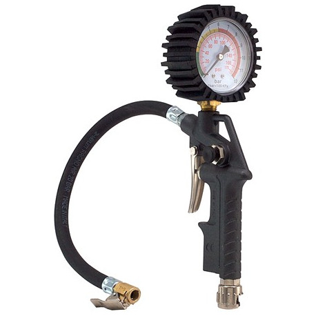 Pistola di gonfiaggio in alluminio sabbiata e verniciata con manometro diametro 63 mm e testina in zama. Pressione manometro max: 0-12 bar. Lunghezza tubo 300 mm.