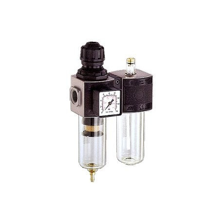 Regolatore con cartuccia filtrante in PE che trattiene impurita' fino a 50 micron, filtro con deflettore e convogliatore per una efficace separazione della condensa. Valvola di scarico incorporata, portata l/min 2800. Filettatura entrata/uscita 3/8".