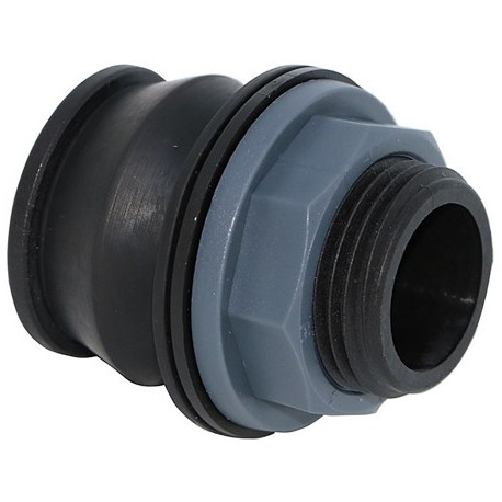 Raccordo rapido a innesto per serbaoio, ridotto MF in PP. Consente l'applicazione dall'esterno senza accesso alla parete interna. Estremita' maschio filettata munita di guarnizione NBR. Anello piano rigido in PP. Collare di serraggio nero. Filettatura femmina ridotta.