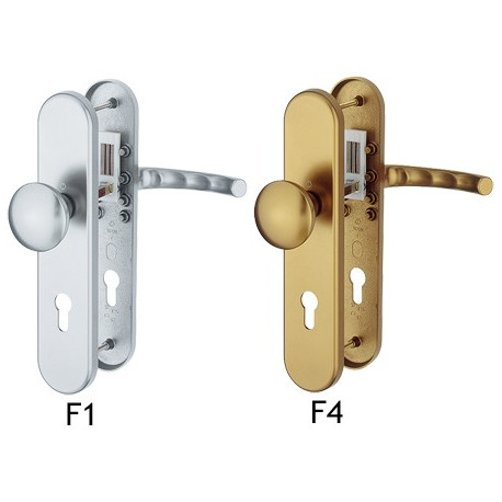 Guarniture complete di pomolo fisso e maniglia con placca lunga per porte d'ingresso. Foro yale. Dimensione quadro 8 mm. Misura placca mm 268x58. Diametro pomolo 60 mm. Spessore porta 45-62 mm.