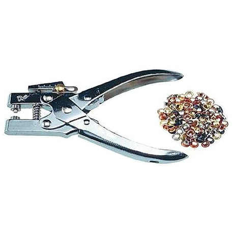 Pinza in acciaio per occhioli diametro interno 4 mm. In scatola comprendente 100 pezzi occhioli.