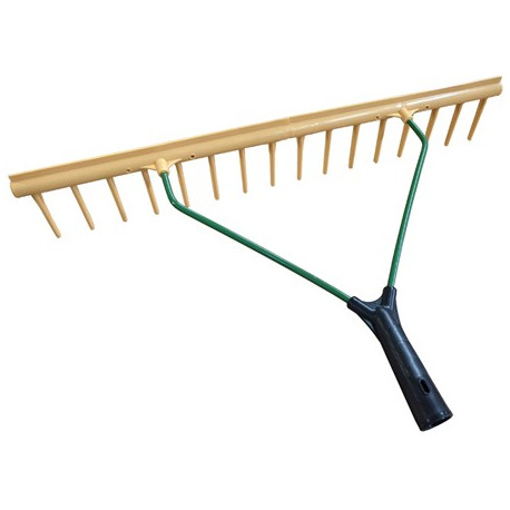 Realizzato in ABS con tiranti in acciaio e attacco conico. A 16 denti diritti su un solo lato. Dotato di raschietto per il livellamento della terra. Larghezza cm 64
