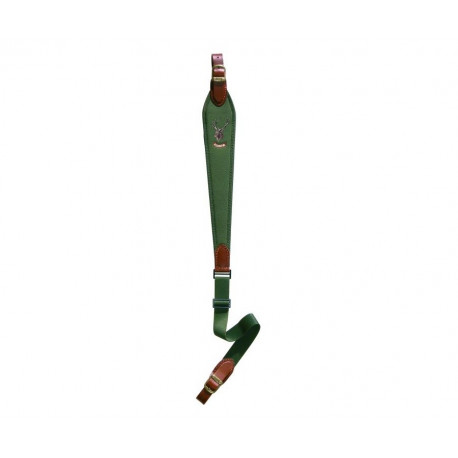 Tracolla regolabile per carabina realizzata in Cordura Naturelle ed interamente bordata in nastro verde. Retro in gomma antiscivolo per una perfetta aderenza alla spalla. Attacchi regolabili in pelle e fibbie in metallo ottonato.