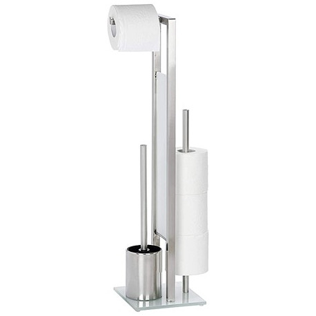 Piantana con portarotolo, riserva rotoli e portascopino. In acciaio inox. Dimensioni 18x19x69h cm. Peso 2 kg.