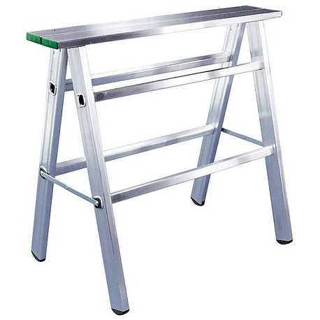 Cavalletto in alluminio chiudibile con cerniera in alluminio e compassi in acciaio antidivaricamento. Dimensioni 90x16,5 cm. Altezza 83,5 cm. Capacita' 300 kg. Peso 6 kg.