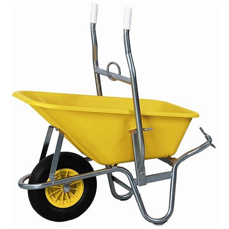 Carriola con telaio zincato e vasca in polipropilene da 100 lt. Dotata di stanghe ribaltabili e gancio di sollevamento. Ruota pneumatica 400x80 mm su cuscinetti.
