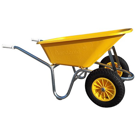 Carriola a 2 ruote con telaio zincato. Ruote pneumatiche da 400x80 mm su cuscinetti. Vasca in polipropilene da 100 lt.