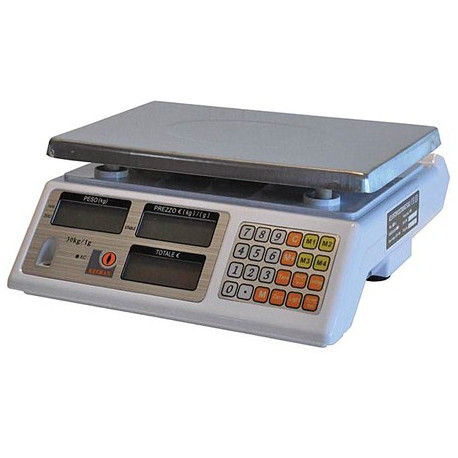 Funzione conta-pezzi: impostando il peso unitario calcola il numero di pezzi complessivo. Funzione calcolo-prezzi: impostando il prezzo unitario calcola il costo totale. Portata 30 kg. Divisione 1 g. Dimensioni piatto 28x20 cm = cavo alimentazione