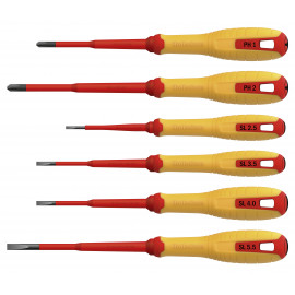 Set di 6 cacciaviti, sviluppati per uso professionale insieme agli artigiani. Contiene PZ 1 e 2 e cacciaviti a taglio nelle misure 3, 4, 5.5 e 6.5. Design ergonomico per un comfort ottimale. La lunga impugnatura rivestita in gomma garantisce la presa per la precisione e la massima trasmissione di potenza. L'impugnatura è realizzata in resistente pl
