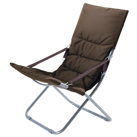 Poltrona sdraio imbottita, pieghevole con struttura in tubo d'acciaio diametro 24 mm, fodera e imbottitura color marrone in poliestere. Piedini antiscivolo e braccioli in tessuto. Dimensioni 80x60x92 cm.