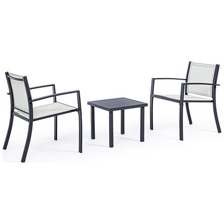 Struttura in acciaio verniciato a polvere, seduta e schienale in textilene 2x1. Colore textilene in contrasto con il colore della struttura. Tavolino con vetro temperato e stampato. Viteria in acciaio galvanizzato. Colore struttura antracite
