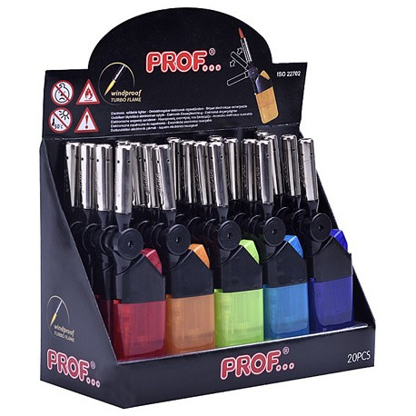 Espositore da banco da 20 pezzi di accendigas corti pieghevoli. Sistema antivento, ricaricabili. Lunghezza totale cm 12,5. Colori assortiti.