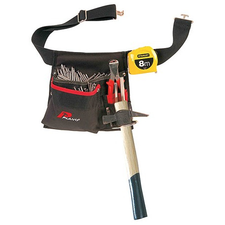 Borsa in tessuto speciale rinforzato con porta martello e porta metro in metallo. Ampia tasca frontale per chiodi. Chiusure in metallo a sganciamento rapido.
