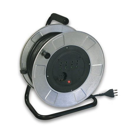 Cavalletto e tamburo metallico. 4 prese 2P+T 16A bipasso + 1 presa Schuko. Spina: 2P+T 16A. Sezione 3 x 1,50 mm2. Lunghezza cavo m 50 =