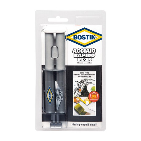 Adesivo epossidico bicomponente di colore acciaio naturale. Agisce perfettamente in soli 5 minuti. Ideale per metalli tra loro e con altri materiali. Ricostruisce, ottura, incolla. Non ritira. Elevata resistenza. E' lavorabile con utensili, carteggiabile e verniciabile. Resiste ad acqua, acidi, oli e diversi solventi. Forte presa. Contenuto 24 ml.