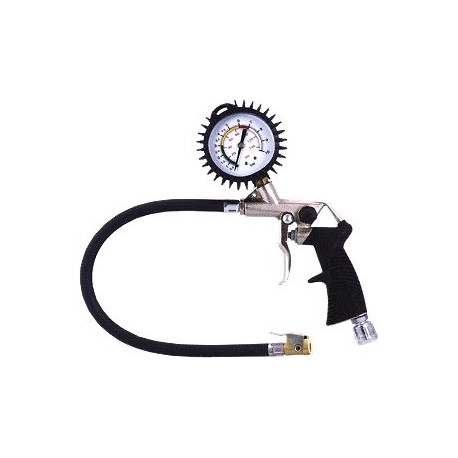 Corpo in alluminio nichelato, impugnatura in gomma. Manometro diametro mm 63 tarato fino a bar 10. Tubo in gomma da mm 400. Attacco 11A