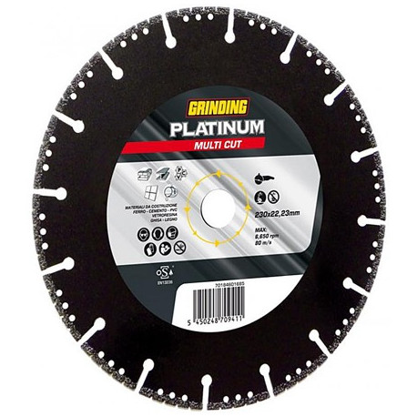 Disco diamantato con corona con asole di sfogo. Consente un taglio rapido su un'ampia gamma di materiali da costruzione, ghisa duttile, plastiche, composti rinforzati con fibra di vetro e legno, generalmente difficili da tagliare con i dischi diamantati tradizionali. Foro da 22,2 mm.