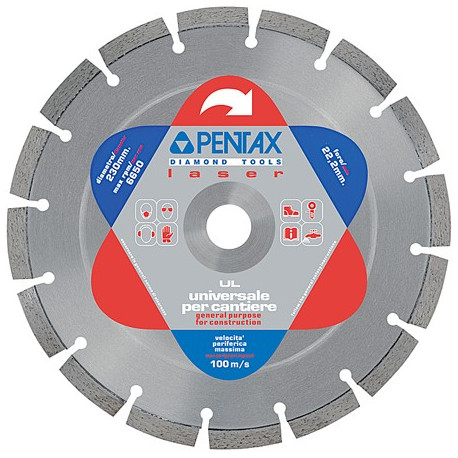 Disco diamantato a settori con saldatura al laser. Ideale per cemento, cotto e mattoni. Adatto anche per cemento armato, betonella, ghiaino lavato, poroton, marmo, granito, tufo e klinker. Foro da 22,2 mm. Altezza corona 10 mm.