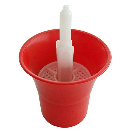 Svolge una doppia funzione di sciacquabottiglie in plastica con filtro e avvinatore. Colore rosso. Altezza 12 cm.