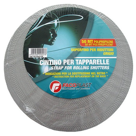 Cintino grigio in polipropilene per tapparelle. Supersottile. Larghezza 19 mm. Lunghezza rotolo 50 m.