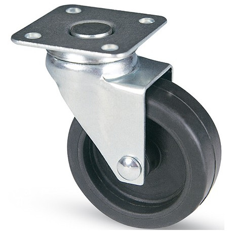 Ruota in gomma sintetica nera con piastra girevole su doppia corona di sfere. L'impiego e' consigliato per mobili d'ufficio, espositori, ecc..