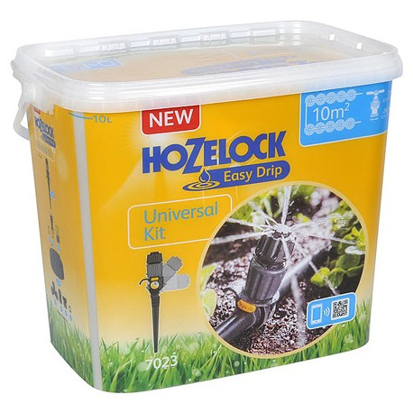 Kit completo d'irrigazione per una superficie fino a 10 m2. Contiene: 1 riduttore di pressione, 1 tubo flessibile diametro 13 mm x 15 m di lunghezza, 10 gocciolatori universali, 5 clip per tenuta, 2 tappi d'estremita', 1 raccordo diritto e 1 giunto a T.