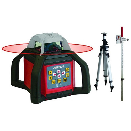 Kit composto da: 1 laser 61350, 1 asta telescopica da 2,4 mt e 1 treppiedi regolabile tra 95 e 195 cm con attacco 5/8''. Laser rotante con telecomando e ricevitore. Portata 500 mt con ricevitore. Funzioni: piano orizzontale, piano verticale, scanner, tilt, inclinazioni manuali assi X e Y. Batterie ricaricabili NiMH. IP65. Laser 635 nm (Classe 2). Precisione +/-3 mm/30 m