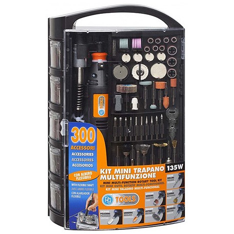 Potenza 135 W. Velocita' 8000-30000 giri/min. Pulsante blocco albero, velocita' variabile. In valigietta con albero flessibile e 300 accessori selezionati